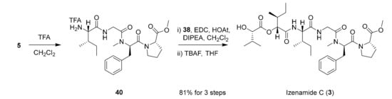 We finally assembled the prepared fragments of izenamide C as shown in Scheme 7. The EDC-mediated amide coupling of amine 40, which was prepared from tetrapeptide 5, with acid 38 followed by silyl-deprotection produced izenamide C (3) in 81% over 3 steps.