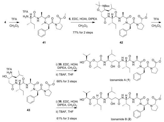 The completed synthesis of izenamides A (1) and B (2) is illustrated in Scheme 8. Boc-deprotection of tetrapeptide 4 with TFA and amide coupling with acid 6 afforded pentapeptide 42 in 77% yield over two steps. Global deprotection under acidic conditions followed by amidation of the resulting amine with acids 39 or 38 produced the corresponding heptapeptides. Finally, desilylation of heptapeptides afforded izenamides A (1) and B (2) in 66% and 61% over 3 steps, respectively. Spectral data of the synthesized depsipeptides 1, 2, and 3 were all identical with the reported data of natural 1, 2 and 3 [25]. Moreover, the absolute configuration of the statine moiety in 2 was identical to that of 1. The 1H and 13C NMR spectra of some compounds are in the Supplementary Materials.