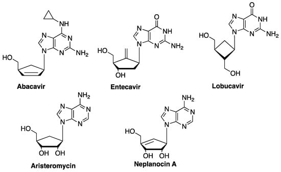 - Matyugina, E.S.; Khandazhinskaya, A.L.; Kochetkov, S.N. Carbocyclic nucleoside analogues: Classification, target enzymes, mechanisms of action and synthesis. Russ. Chem. Rev. 2012, 81, 729–746. [Google Scholar] [CrossRef]