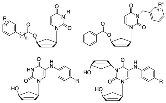 - Agrofoglio, L.; Suhas, E.; Farese, A.; Condom, R.; Challand, S.R.; Earl, R.A.; Guedj, R. Synthesis of carbocyclic nucleosides. Tetrahedron 1994, 50, 10611–10670. [Google Scholar] [CrossRef]