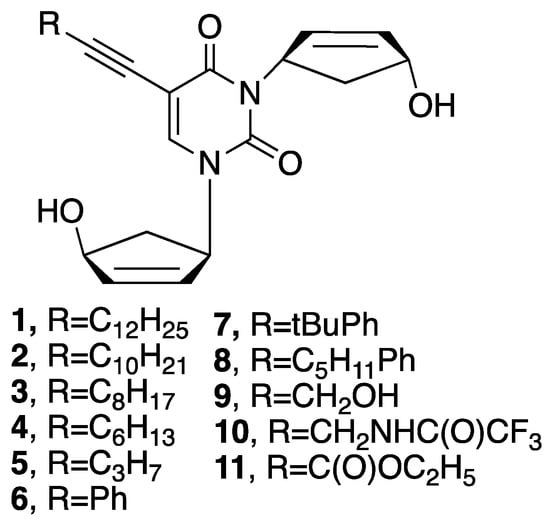 As a result of these observations, a series of 5'-norcarbocyclic uracil derivatives with various 5-alkynyl or 5-arylalkynyl substituents (Figure 3) were designed relative to the parent compound 1, in an effort to explore their potential biological activity and function.