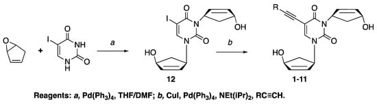 Conveniently, compound 12, the key intermediate for the target products synthesis (Scheme 1), was previously reported as side product [9]. As a result, we used the same method of synthesis, but enhanced an excess of epoxy-cyclopentene (3 mol eqv instead of 1.3) to improve the yield. Unlike many synthetic routes to realize carbocyclic nucleosides [10,11], the synthesis of the compounds was straightforward and followed a route previously reported from our group [7,9]. Products 1–11 were obtained as racemic mixtures, in good yields, but the presence of a large number of minor impurities in the reaction mixture forced us to consistently use two different chromatographic systems. All target compounds were verified for structural accuracy and purity using spectroscopic and analytical methods as described in the experimental section.
