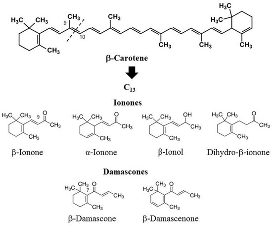 Oxidative cleavage of the carotenoid chain may occur in a number of locations (bonds from 6–7 to 9–10, respectively) resulting in a variety of compounds from the classes of C9 to C13-isoprenoids, many of which are important fragrances and constituents of tobacco flavor [10,19]. The C13-norisoprenoids with an oxygen function in the side chain include two basic families of constituents, differing by the position of the oxygen function—at carbon atom 9 for the ionones and at carbon atom 7 for the damascones. A simplified scheme of carotenoid-derived compounds related to this study is presented in Figure 1.