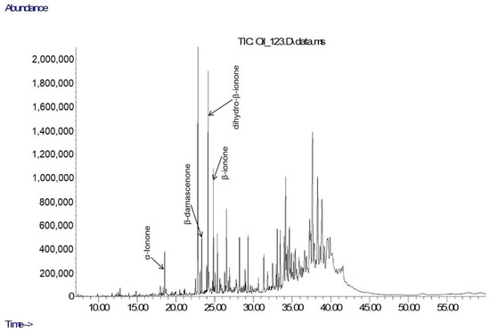 The content of the main aroma-impact compounds from β-carotene degradation identified in the EOs [21,22] are presented in Table 2, and an example of the total ion current (TIC) chromatograms (GC-MS) of the analyzed EOs is given on Figure 2. Data in Table 2 are given as relative content (% of TIC) and as calculated true content (mg/100 g DW) in order to provide a better visualization of results, since the latter values are not influenced by co-distilled volatile species or compound characteristics [3]. In the calculations of constituents’ contents response factors were assumed equal for all compounds. The sum of carotenoid derivatives in the EOs (mg/100 g DW) was less than the total carotenoid content in the initial plant material, which suggested that carotenoid transformation during the distillation of EOs involved other products besides the GC-MS quantified volatiles.