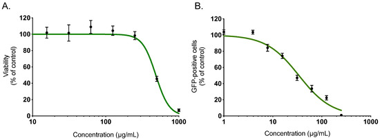 Within a project aiming to investigate the potential antiviral activity of medicinal plants from Reunion Island recently registered in the French Pharmacopeia, this study evaluated the anti-ZIKV activity of Ayapana triplinervis essential oil. After extraction of EO from the fresh aerial part of A. triplinervis, we initially performed A. triplinervis EO for cellular cytotoxicity using human A549 cells. Dose-dependent experiments showed that the higher nontoxic concentration of EO (more than 90% of cell viability) was 300 µg/mL (Figure 1A). By nonlinear regression analysis, the CC50 value was calculated as 475 µg/mL (Table 1). We reported that ZIKV replicates efficiently in human lung epithelial A549 cells [40]. Thus, to assess whether EO inhibits ZIKV infection, A549 cells were infected 24 h with the molecular clone of ZIKV expressing the GFP (ZIKVGFP) at the MOI (Multiplicity Of Infection) of 1 in the presence of different concentrations (250, 125, 62,5, 31, 25, 15, 62, 7, 8, 4, and 1 µg/mL) of EO throughout the infection (Figure 1B). By flow cytometric analysis, we showed that EO treatment resulted in a severe inhibition of ZIKV infection in A549 cells (Figure 1B). The number of GFP-positive cells decreased ~80 % compared to nontreated control cells when 125 µg/mL of EO was added through the experiment (Figure 1B). The 50% inhibitory concentration (IC50) value was evaluated at 38 µg/mL (Table 1).