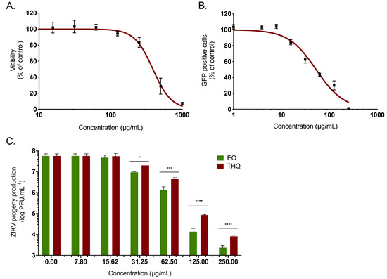 To measure the direct effect of the EO and THQ on viral infectivity (free-virus particles), ZIKVGFP (2 × 105 PFU) were mixed with EO or THQ at 125 µg/mL and then incubated at 37 °C for 2 h. The mixture was diluted 50-fold (final virus concentration, 1 PFU/cell) in MEM containing 10% FBS to yield a subtherapeutic concentration of EO or THQ, and this mixture was subsequently added to A549 cells monolayer seeded in a 6-well plates. As a comparison, ZIKVGFP was mixed with EO or THQ, diluted immediately to 50-fold (no incubation period), and added to cells for infection. After 2 h of adsorption at 37 °C, the diluted inocula were discarded, and cells were washed with PBS twice. Medium overlay was applied and the plates were further incubated at 37 °C for 24 h.