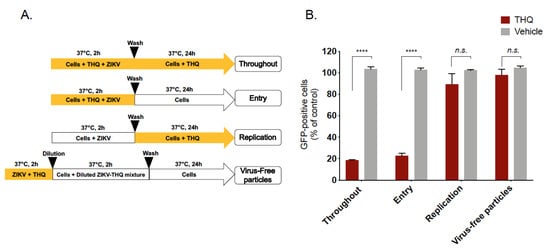 To further elucidate the underlying mechanism of THQ antiviral activity, we subsequently tested the effect of THQ on ZIKV entry steps. We first investigated whether THQ was able to affect viral attachment. Thus, binding assays were performed at 4 °C which allows virus binding but prevents viral entry (Figure 4A). Epigallocatechin gallate, EGCG, the main polyphenol compound from green tea, which is known to inhibit ZIKV binding, was used as positive control [14,16,17]. After 1h of ZIKV attachment in the presence of THQ, the temperature was shifted to 37 °C without THQ to allow ZIKV internalization (Figure 4A). Our data show that the percentage of fluorescence in ZIKV-infected A549 cells was similar to untreated control cells. However, EGCG significantly inhibits ZIKV attachment to the cell membrane (Figure 4A). Taken together, these results demonstrate that THQ is not able to inhibit ZIKV binding, suggesting that a postattachment step of the infectious virus cycle could be altered.