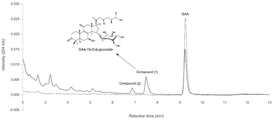 Biotransformation of ganoderic acid A (GAA) by Bacillus subtilis ATCC 6633 after 24 h of incubation (solid line). The figure was modified from Figure 1 of our previous study [17].