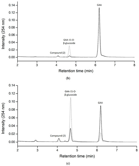 A few reports demonstrated that triterpenoid glycosides may improve the bioactivity of the triterpenoid aglycone [5]. Liang et al. produced an unusual ginsenoside, 3β, 12β-di-O-Glc-protopanaxadiol (PPD), from the glucosylation of PPD by UGT109A1, and showed that the ginsenoside had anti-cancer capabilities in the Lewis lung cancer xenograft mouse model [23]. Wang et al. used BsGT1 to produce 3β-O-Glc-ginsenoside F1, which inhibited melanin and tyrosinase activities [25]. Dai et al. reported the enzymatic synthesis of glycyrrhetinic acid (GA) glucosides—GA-30-O-β-glucoside and GA-3-O-β-glucoside—by BsYjiC and found that the two triterpenoid glucosides had higher water solubility and higher cytotoxicity against human liver cancer cells HepG2 and breast cancer cells MCF-7 than GA aglycone [20]. Therefore, the new GAA glucoside obtained in the present study, GAA-26-O-β-glucoside, warrants future investigation to determine whether it also has a higher bioactivity than GAA aglycone.