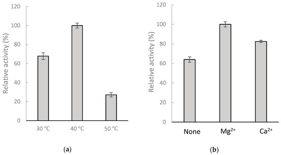 The production of compound (2) from GAA by BsGT110 under different temperature or metal ion conditions. The standard condition was set as 15 μg/mL purified enzyme, 1 mg/mL GAA, 10 mM MgCl2, and 10 mM UDP-glucose in 50 mM acetate buffer at pH 6.0 and 40 °C. The tests were carried out by changing only the temperature (a) or metal ions (b) and maintaining all other settings. Relative activities were obtained by dividing the area summation of the UPLC reaction peak of the test condition by that of the standard condition. The data are expressed as mean ± SD, n = 3.
