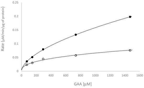 Kinetic study of BsGT110 at pH 6 (closed symbols) and pH 7 (open symbols). Different concentrations of GAA were mixed with 15 μg purified BsGT110 protein, 10 mM UDP-glucose, 10 mM MgCl2, and 50 mM PB (pH 7.0) or acetate buffer (pH 6) in 1 mL reaction mixture and incubated at 40 °C for 20 min. During the incubation, samples from each reaction were removed and analyzed by UPLC every 2 min. The reaction rate for each concentration of GAA was obtained from the slope of the plot of the amount of product over time. The UPLC operation procedure was described in the Materials and Methods section.