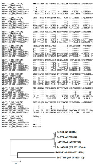 According to the Carbohydrate-Active Enzymes (CAZy) database, GTs can be classified into 107 families, in which GTs that catalyze the glycosylation of small molecules, such as flavonoids and triterpenoids, are classified as GT1 [18]. Although over 500 thousands of GT have been discovered, there are only six bacterial GTs reported to catalyze glycosylation of triterpenoids, including BsYjiC from B. subtilis 168 [11,19,20,21,22], UGT109A1 from B. subtilis CTCG 63501 [23,24], BsGT1 from B. subtilis KCTC 1022 [25], BsUGT398 and BsUGT489 from B. subtilis ATCC 6633 [17], and BsGT110 from B. subtilis ATCC 6633 [present study]. Among them, the BsYjiC group (BsYjiC, BsUGT489, UGT109A1, and BsGT1) were highly similar, sharing more than 90% identity in their amino acid sequences [17], BsGT110 and BsUGT398, however, were not grouped with the BsYjiC group, and only had 31% and 33% identity, respectively, with the BsYjiC group (Figure 6). On the other hand, some bacterial GT1 catalyzed glycosylation of flavonoids. Thus, BsGT110 was compared with the flavonoid-catalyzing GTs. The results showed that the amino acid identity between BsGT110 and other flavonoid-catalyzing bacterial GTs was also lower than 40% (Figure S5 and Table S2). Furthermore, the evolutionary tree is shown in Figure 6 also demonstrated the dissimilarity between BsGT110 and BsUGT398, indicating that BsGT110 is a unique bacterial GT with glycosylation activity toward triterpenoids.