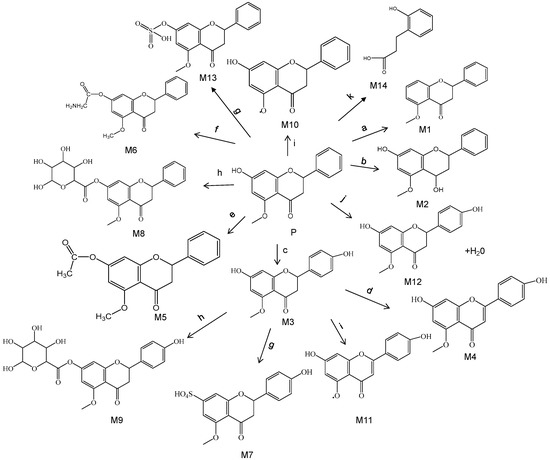 In our study, the metabolites of alpinetin can be explained by eleven proposed pathways: Deoxidation, reduction, oxidation, desaturation, acetylation, glycine conjugation, sulfation, glucuronidation, demethylation, hydration and cleavage. In recent years, more and more attention has been paid to the metabolic process of flavonoids [22]. The metabolic pathways of flavonoids mainly include conjugation, cleavage and oxidation in vivo [23,24], which is consistent with the conclusions of the metabolic characteristics of alpinetin in our study. However, to date, there are no systematic and detailed data on alpinetin metabolites. This study enriched the known metabolic types of alpinetin and made the study of alpinetin metabolism more comprehensive.