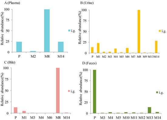 Metabolite profile in plasma (A), urine (B), bile (C), and feces (D) after administration of alpinetin. Relative abundances are expressed by the percentage of MS response with the most abundant compound being 100.