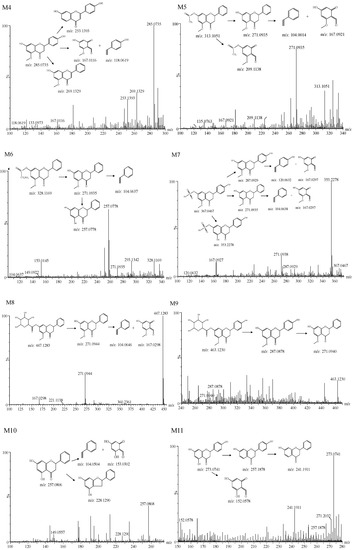 M11 was only found in feces. M11 eluted at 15.96 min, which exhibited a [M + H]+ ion at m/z 273.0741 (C15H13O5), 14.0188 Da less than that of M3. This result indicated that M11 was a demethylated metabolite of M3. Fragment ions of m/z 257.1676 were produced from fragment ion m/z 273.0730 by the loss of -O. The typical ions m/z 241.1911 were produced from precursor ion m/z 257.1878 by the loss of -O. The fragment ions at m/z 152.0578 derived from precursor ion m/z 273.0741 by the Retro Diels–Alder reaction.