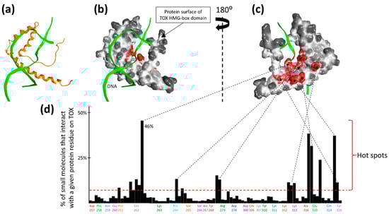 Druggability of the HMG-box domain of TOX. (a) TOX–DNA interface as determined from Figure 1C. TOX HMG-box domain in orange ribbons, DNA in green ribbons. (b) Molecular surface presentation of the TOX HMG-box domain, in the same orientation as (a). (c) The TOX HMG-box domain is rotated by 180° to illustrate the small-molecule binding hot spots (red). (d) A total of 200,000 drug-like molecules were docked to the TOX HMG-box domain. The percentage of interacting small molecules is shown for each protein residue as a bar graph (multiple interactions/contacts are represented as separate bars for each amino acid). Protein residues, including Gln262, Pro264, Arg273, Lys313, Glu320, Gln324, and Tyr 328, that interacted with at least 10% of the small molecules, have been highlighted and mapped to their corresponding locations as hot spots (red surface patches) on the TOX HMG-box domain.