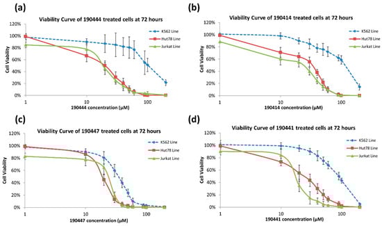 Viability curves of TOX-high and TOX-low expressing cells. Cells were treated with various concentrations of compounds, (a) 190444, (b) 190414, (c) 190447 and (d) 190441, for 72 h in a 37 °C incubator with 5% CO2. Viability was measured by CellTiter-Blue® assay and compared to the DMSO control, as described in Materials and Methods. Jurkat and Hut78 cells (solid line) were the TOX-high-expressing cell lines, while K562 (dotted line) was the TOX-low-expressing cell line.
