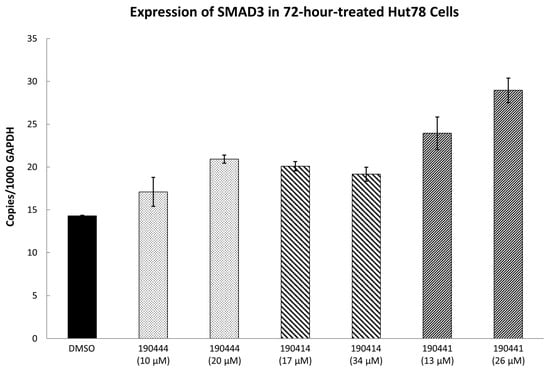 SMAD3 expression in compound-treated Hut78 cells. Hut78 cells were treated with compounds 190444, 190414 and 190441 at their corresponding IC50 and half of IC50 concentrations for 72 h before RNA extraction for realtime measurement of the SMAD3 expression level. Primers for SMAD3 forward—CCC AGA GCA ATA TTC CAG AGA C, reverse—GTC CAT GCT GTG GTT CAT CT. Expression level of SMAD3 was normalized by internal level of glyceraldehyde-3-phosphate dehydrogenase (GAPDH), as described in Materials and Methods.