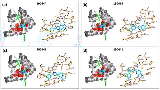 While previous studies [] have established TOX as a promising drug target for CTCL therapies, there is a lack of small molecules that can directly inhibit TOX. By utilizing an established computer-aided drug design (CADD) platform [] followed by in vitro experimental validation, we discovered a list of 18 small molecules that can inhibit the viability of TOX-high/-dependent cells with micromolar IC50 and up to 4-fold selectivity (Table 1). As illustrated in Figure 5, compounds 190444, 190414, 190447 and 190441 can bind at the hot spots located in close proximity to the protein–DNA interface on the HMG-box domain of TOX. These SMIs interact with TOX protein residues including Gln262, Pro264, Arg273, Lys313, Glu320, and Gln324 through hydrogen-bond and hydrophobic interactions, corresponding well to the hot spots as identified from the druggability assessment (Figure 2 and Figure 5). Most of the active molecules identified share common substructures including diazole, triazole and imidazolidinedione, the NH group of which forms a hydrogen bond with the residues such as Gln262 and Glu320. These common substructures could be utilized as a part of a pharmacophore model for selecting new compounds.