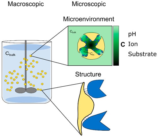 The internal milieu for immobilized enzymes is affected by two factors in particular. Firstly, there is solute partitioning between the liquid phase and the solid phase of the carrier. The partitioning is due to the chemical properties of the solid material (e.g., hydrophobicity and charge), creating a distinct surface-near environment with respect to polarity, dielectric and ionic strength [,,,]. Secondly, there is the interplay between reaction and diffusion. Mass transfer by diffusion occurs from the liquid bulk to the surface of the carrier and from the surface into the pores of the particle. When diffusion is not much faster than reaction, gradients in the substrate and product concentration arise between the bulk and the carrier. At steady state, therefore, the chemical milieu in bulk and in particle is different [,]. Enzyme performance is influenced by the changes in microenvironment (Figure 1). A key performance parameter is the catalytic rate (activity). This depends on substrate and product concentration, as well as on pH and ionic strength. Besides the kinetic effect, changes in the critical concentrations can affect the reaction equilibrium constant and the effective mass-action ratio in the solid particle. Another important enzyme parameter is stability. This may also be affected by changes in milieu parameters; the pH, for example.