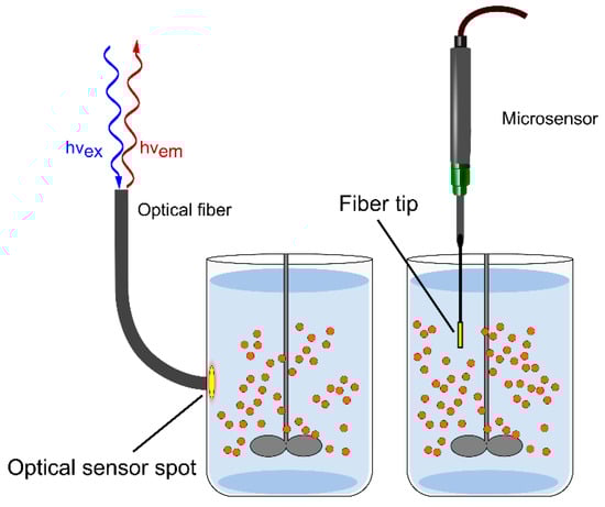 For sensing in liquid solution, opto-chemical sensors are commercially available in numerous formats, such as layers or spots, fiber-optic (micro)sensors, and sensor particles in micro or nanometer sizes [,,,,] (Figure 2). The basic format consists of indicator molecules immobilized in an analyte-permeable polymer layer. The sensitive material is further system-integrated by controlled deposition as in sensor spots and optical fiber tips, enabling different and often contactless optical readouts; e.g., from the wall of a transparent reaction vessel [] (Figure 2). The sensor format determines the mode, or state, of sensor integration into the enzyme reactor []. The different formats allow for a non-invasive flexible application at suitable measurement positions, and for an analytic read-out at the microscopic scale [,]. The sensors can be employed as single analyte detection units or as multi-parameter detection units. Quantification of diverse analytes in the homogeneous liquid phase, or in proximity to a solid-liquid interface, is, therefore, possible with ready-to-use technologies. The method is flexibly applicable to very different reactor configurations, from reaction vessels to microfluidic systems working as continuous flow reactors [,,]. Moreover, opto-chemical sensing can be applied largely independent of geometry, scale and operational parameters of the reactor used.