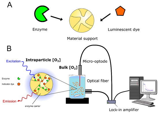 Opto-chemical sensing in enzyme immobilizates. (A) Preparation of analyte-sensitive carrier material and enzyme immobilization. (B) Application to space-averaged, time-resolved determination of internal concentrations. Figure 3B was adapted from reference [] with permission from John Wiley and Sons.