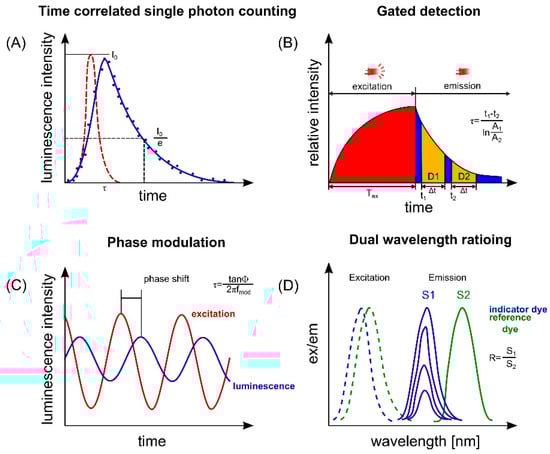 Measurement methods applied in optical sensing. (A) Luminescence lifetime determination by time-correlated single-photon counting. (B) Lifetime determination by gated detection: rapid lifetime determination is shown. (C) Lifetime determination by phase modulation. (D) Dual wavelength ratioing. The figure was reproduced from reference [] with permission from Elsevier.