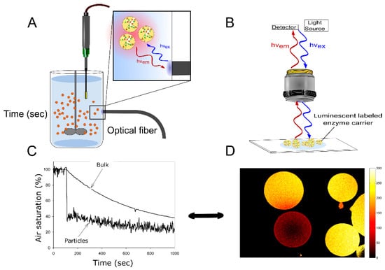 Read-out strategy and spatiotemporal resolution provided by opto-chemical sensing in enzyme immobilizates. (A) Interfacing fiber optics with oxygen sensitive particles for space-averaged determination of intraparticle analyte concentrations. (B) Interfacing opto-chemical sensing with a microscopy set-up for the spatial resolution of intraparticle concentrations in stagnant solutions or in a fixed bed. (C) Time courses of the average intraparticle oxygen concentration and the corresponding oxygen concentration in bulk when O2 is utilized as substrate by an immobilized enzyme. (D) Example of the spatial resolution of intraparticle oxygen concentration. The figure was adapted from reference [] with permission from Elsevier.