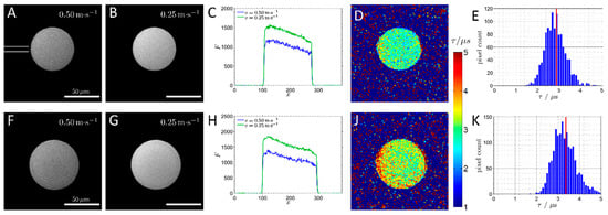 Luminescence lifetime imaging of agarose beads with immobilized Ru(dpp)3 immersed in air-saturated buffer (A–E) and in buffer with enzymatically depleted oxygen (F–K). The luminescence intensity of the beads is lower at higher scan speed (A,B,F,G). (C, H) The intensity profiles across the central part of the beads, as marked by two white lines in (A). (D,J) The luminescence lifetime images. (E, K) Pixel lifetime distributions of the beads shown in (D) and (J) with the mean values marked by red lines. Reproduced with permission from reference []. Copyright (2016) American Chemical Society.