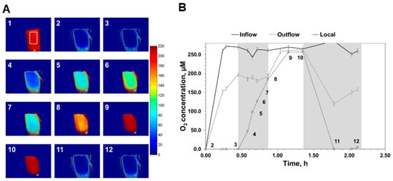 Results of internal and external O2 concentration measurements during the operation of a falling-film microreactor containing immobilized D-amino acid oxidase on the microchannel walls of the plate. Panel (A) shows the local O2 concentration on the plate in hPa (1 hPa is equivalent to 1.16 μM at 30 °C). The region of interest for measurement is comprised of a rectangle located at the lower end of the plate, as indicated in the image #1 of panel (A). Panel (B) shows O2 concentration measurements with the flow-through sensors at the reactor entrance and exit and compares these measurements to the results of on-plate O2 concentration measurements. Numbering is used to identify images from the upper panel that correspond to the local O2 concentrations shown in the lower panel. In the first phase of the experiment (#2–3), the FFMR was operated with nitrogen flow, resulting in a complete deoxygenation of the plate. When the air flow was switched on (#3–8), the local O2 concentration increased sharply, revealing a highly effective O2 supply from the gas phase to the liquid phase. Eventually, air saturation was reached despite consumption of O2 for the enzymatic reaction (#9–10). Deoxygenation was only possible when air was again replaced by N2 (#11–12). Figure was adapted from reference [] with permission from John Wiley and Sons.