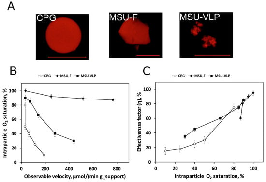 The effects of intraparticle oxygen concentration (expressed as relative air saturation in percent) on the activity of silica-based biocatalysts. (A) Confocal fluorescence images of the oxygen-sensitive luminescence dye immobilized on different porous silica supports (from left to right, CPG, MSU-VLP and MSU-F silica materials). (B) The dependence of the O2 concentration inside the porous support (at apparent steady state) on the velocity of D-methionine oxidation by the immobilized oxidase (D-amino acid oxidase) biocatalyst. (C) The dependence of the enzyme effectiveness of the biocatalyst on the intraparticle O2 concentration. All reactions were performed at 30 °C using air-saturated potassium phosphate buffer (50 mM; pH 8.0). Adapted with permission from reference []. Copyright (2015) American Chemical Society.