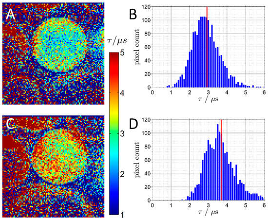 Luminescence lifetime images of beads with immobilized enzyme and Ru(dpp)3. Panels show imaging results under flow with (C,D) and without (A,B) substrate, resulting in different oxygen concentrations. (B,D) Pixel lifetime distributions of the beads are shown in (A) and (C), with the mean values marked by red lines. Adapted with permission from reference []. Copyright (2016) American Chemical Society.