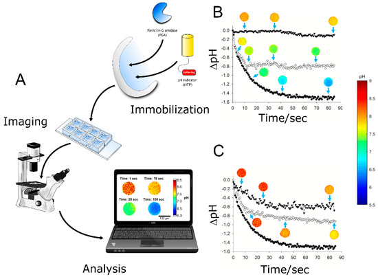 A new method for spatiotemporally resolved measurement of pH in immobilized enzymes has been implemented based on immobilized sYFP []. Its application was demonstrated for monitoring the internal pH of an immobilized penicillin acylase during the hydrolysis of penicillin. Conversion of the penicillin releases a proton. It was shown that sYFP is as a powerful pH indicator for ratiometric optical sensing that facilitates applications in real time within porous materials. A reaction setup was used in which agarose particles containing immobilized sYFP and penicillin acylase (catalyst particle) were kept static in stagnant suspension. The experiment was designed to monitor the initial reaction rate, immediately after addition of the substrate (Figure 10). The time course consists of a pronounced pH drop within the first seconds of reaction, followed by a slower phase of pH decrease. At apparent steady state, a pH difference of ~1.5 pH units between bulk and the catalyst particles prevailed. Both the dynamics and magnitude of the pH gradient reflect the coupling of proton-releasing reaction confined to the solid surface of the catalyst particle’s pores and the molecular diffusion events inside these pores.