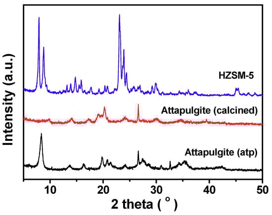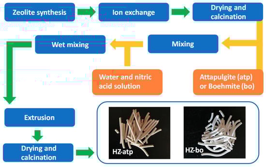 Two zeolite extrudates (the novel extrudate HZ-atp and the conventional extrudate HZ-bo) were obtained following a standard industrial protocol (Figure 1). The dry mass ratio of H-ZSM-5 zeolite and attapulgite or boehmite binders is 1:1. Herein, the compositional difference between two binders is noteworthy. Boehmite (AlOOH), a traditional binder, becomes aluminum oxide (Al2O3) after calcination in air []. Attapulgite, a natural clay, is composed of 66.4 SiO2/15.7 MgO/10.2 Al2O3/5.3 Fe2O3/1.5 CaO/0.9 K2O, revealed by X-ray fluorescence spectroscopy analysis.