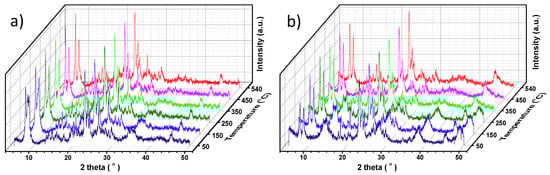 In situ XRD patterns of HZ-atp (a) and HZ-bo (b); in situ scanning at 100 °C steps from 50 °C to 540 °C under synthetic air.