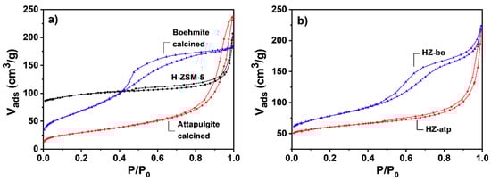 To measure the textural properties of the pure H-ZSM-5 zeolite, the pure binders and the zeolite extrudates (HZ-atp and HZ-bo), N2 physical adsorption at −196 °C was employed. As shown in Figure 5, the N2 adsorption isotherm of the H-ZSM-5 zeolite powder exhibits type I(b) behavior, according to IUPAC classification []. The major uptake at low relative pressure (P/P0 < 0.01) is associated with micropore filling. The uptake at high relative pressure (P/P0 > 0.8) is referred to the intercrystalline mesopores and macropores caused by small crystal aggregation, which is observed in SEM. The N2 adsorption/desorption isotherms of the boehmite-derived Al2O3 binder powder belongs to type IV(a) isotherm. The first stage of adsorption uptake corresponds to the initial monolayer-multilayer adsorption on the mesopore wall []. The following uptake in the P/P0 range of 0.4–0.8 corresponds to capillary condensation, which is accompanied by a type H2(a) hysteresis loop. Such isotherms indicate that the boehmite-derived Al2O3 binder mainly contains mesopores. The N2 adsorption isotherm of the attapulgite-derived binder powder features type II characteristics. The gradually increasing adsorbed amount as a function of the relative pressure and vast uptake at high relative pressure indicates the presence of macropores in the material. The N2 isotherms of zeolite-binder composites HZ-atp and HZ-bo extrudates showed both characteristic features of the isotherms of H-ZSM-5 and the pure binders. Isotherm with shape that are intermediate between type I(b) and type II is observed on HZ-atp. Likewise, isotherm of HZ-bo features type I/IV characteristics. In both isotherms, the reduction in low relative pressure uptakes of HZ-atp and HZ-bo resulted from the incorporation of binders. The significant uptakes observed at high relative pressure are attributed to the filling of the mesopores and macropores introduced via binders. The BET (Brunauer, Emmett and Teller) surface areas of the extrudates (listed in Table 1) are slightly lower than the calculated surface areas based on the proportional contributions of the zeolite and binder phases. The micropore volume calculated using t-plot method was also listed in Table 1. The micropore volume of HZ-atp (0.07 cm3/g) was half of the micropore volume of H-ZSM-5 (0.13 cm3/g), while micropore volume of HZ-bo was lower (0.04 cm3/g). Such results imply that most micropores in H-ZSM-5 are accessible after the extrusion with attapulgite, since the extrudates contain 50 wt% H-ZSM-5 zeolite powder. However, some micropores in HZ-bo might be blocked after extrusion with boehmite.
