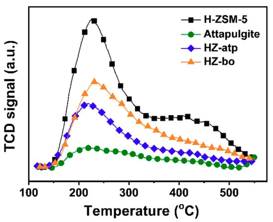 The acidity of the extrudate catalysts were investigated by using temperature-programmed desorption of ammonia (NH3-TPD). The information on the acid strength together with the amount of acid sites over solid acid catalysts can be derived from the NH3-TPD profiles. The NH3 desorption peak temperature reflects the acid strength and the area of desorption peak represents the quantity of acid sites. As shown in Figure 6, two major acid sites were identified on the H-ZSM-5 zeolite and the zeolite extrudates (HZ-atp and HZ-bo), i.e., weak acid sites (temperature peak at around 220 °C), and strong acid sites (temperature peak at around 430 °C). For ZSM-5 zeolite, the strong acid sites are mainly Brønsted acid []. The area of desorption peaks was integrated and calculated to determine the amount of total acid sites of the catalysts (presented in Table 1). The much less total acid sites of the zeolite extrudates HZ-atp and HZ-bo indicate the diluting effect of binders []. Compared with HZ-Bo, HZ-atp displayed a lower concentration of acid sites and weaker acid strength. Since no significant pore blocking was detected in the N2 physical adsorption of HZ-atp, it implies that part of the acid sites in HZ-atp were neutralized by some basic species in attapulgite (e.g., MgO) [,,]. Interestingly, when the acid concentration was calculated based on mass of H-ZSM-5 zeolite in the extrudates, the acid sites increased after extrusion with boehmite. This indicates that new acid sites were introduced in the alumina-bound ZSM-5 extrudate.