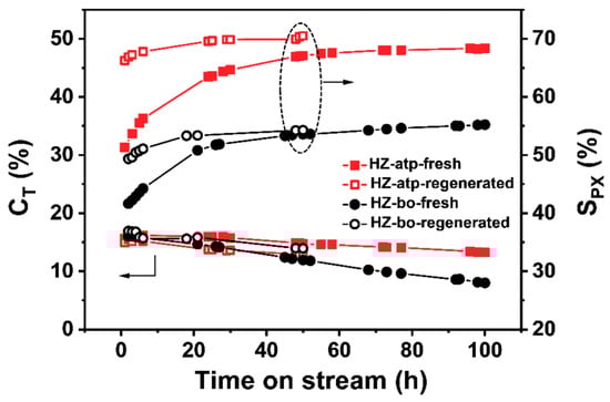As shown in Figure 7, para-selectivity increased slowly and toluene conversion decreased slowly over both zeolite extrudates with time on stream (TOS). Such performance is commonly observed in toluene methylation reaction, which could be owing to the coke species generated during reaction deposited on catalyst surface and blocking some external acid sites and pore openings []. The TGA results showed that the coke content of HZ-bo was higher than HZ-atp (Figure 8). With regard to the coke content, the para-selectivity gap should become smaller after 100 h on stream if coking is the only cause for para-selectivity increment. However, it is observed that the initial para-selectivity gap between HZ-atp and HZ-bo was 11.5%, while this gap went up to 13.1% after 100 h on stream. Thus, there were other causes for the enhanced para-selectivity during reaction.