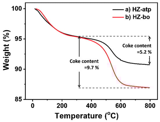 Thermogravimetric analysis (TGA) curves of HZ-atp (black) and HZ-bo (red) after toluene methylation reaction. Coke content was calculated by ([mass of 300 °C] – [mass of 800 °C])/[mass of 800 °C] × 100%.