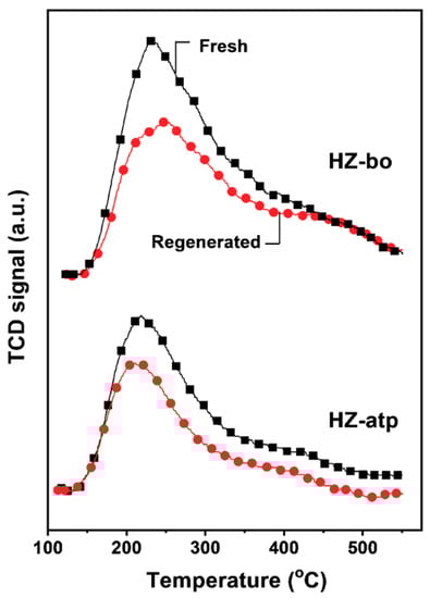 To prove the in-situ modification hypothesis, the reusability of the two zeolite extrudates were tested. Spent HZ-atp and HZ-bo were regenerated at 540 °C under air atmosphere for 4 h. The catalytic performance of regenerated catalysts is shown in Figure 7. The toluene conversions of regenerated catalysts were equivalent to their fresh analogue. In the second cycle, the initial para-selectivity of regenerated HZ-bo was 49.3%, which was lower than the 55.2% para-selectivity after the first cycle, and the para-selectivity of regenerated Z5-bo after 50 h on stream was similar to its fresh analogue. In comparison, the initial para-selectivity of HZ-atp after regeneration was 66.2%, similar to its para-selectivity before regeneration. Moreover, the para-selectivity of regenerated HZ-atp continuously increased with TOS and reached 70.5% after 50 h, higher than the 68.3% para-selectivity after its first cycle. The different changes in para-selectivity over HZ-atp and HZ-bo before and after regeneration suggest an in-situ modification effect of attapulgite. To obtain more evidence of the in-situ modification assumption, acidity changes of fresh and regenerated zeolite extrudates were characterized by NH3-TPD. As shown in Figure 9, the amount of total acid sites of HZ-bo and HZ-atp both decreased after regeneration. The lower acidity of regenerated HZ-bo was mainly attributed to the decrease in weak acid sites, whereas both weak and strong acid sites decreased after the regeneration of HZ-atp. These changes in acidity are consistent with the para-selectivity variation observed in catalyst reusability test and the in-situ modification effect of attapulgite.