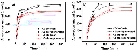 It is well known that in addition to the reduction of acidity, the zeolite modification with oxide may also reduce the effective dimensions of the catalyst pore openings []. The restricted pore openings increase diffusional resistance and, consequently, the para-selectivity in toluene methylation is improved. The extent of pore openings reduction of regenerated zeolite extrudates was evaluated by using n-hexane and cyclohexane adsorption experiments. n-Hexane can enter the channel of ZSM-5 zeolite (a ten-member ring channel) readily while the diffusion of cyclohexane in a ten-member ring channel is limited []. Therefore, the adsorption ratio of n-hexane to cyclohexane over samples is an indicator for the reduction extent of the pore openings [,]. The higher ratio means the larger reduction extent. Figure 10 shows the adsorption isotherms of n-hexane and cyclohexane over the fresh and regenerated zeolite extrudates. All extrudates exhibited similar adsorption rates, yet the saturation adsorption amounts of n-hexane or cyclohexane for four zeolite extrudates were different. Calculated from the saturation adsorption amounts, the n-hexane to cyclohexane adsorption ratio of HZ-bo increased from 1.8 to 1.9 after regeneration, whereas that of HZ-atp decreased from 1.9 to 1.7 after regeneration. It means that the initial para-selectivity increment for regenerated Z5-bo was not only due to the reduced acidity but partially due to the more restricted pore openings, which might be caused by the aluminum species migration in alumina-bound ZSM-5 extrudates [,,]. In the HZ-atp case, the extent of pore openings reduction decreased after regeneration, which indicated that the in-situ modification of acidity was the main reason for the increase of para-selectivity over HZ-atp.