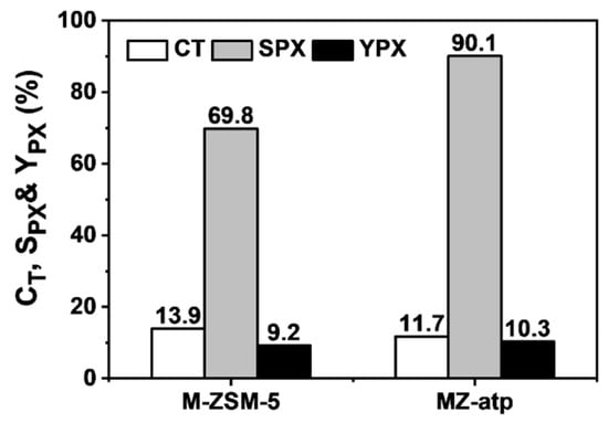 Toluene conversion, para-selectivity and yield of para-xylene over modified ZSM-5 (M-ZSM-5) and its extrudate with attapulgite (MZ-atp). Reaction conditions: 460 °C, atmospheric pressure, WHSV = 15 h−1, nT/nM = 4, nH2/n(T + M) = 2, nH2O/n(T + M) = 2.