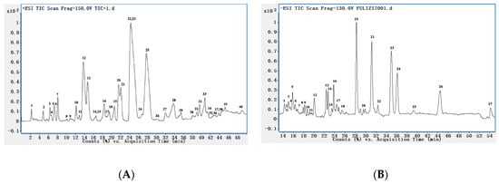 The total ion chromatograms (TIC) of C. bungeana extract in positive (A) and negative (B) ionization mode.
