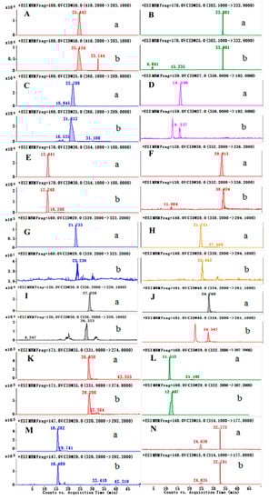 C. bungeana UHPLC-MRM chromatograms. (a) Fourteen alkaloids (Acetylcorynoline (A), 8-oxocorynoline (B), Corynoline (C), Tetrahydropalmatine (D), Protopine (E), Palmatine (F), Columbamine (G), Jateorhizine (H), Berberine (I), Worenine (J), Sanguinarine (K), Berberrubine (L), Coptisine (M), and Z23 (N) reference solutions. (b) Test solution of C. bungeana.
