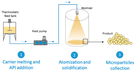 In the past decades SC, also called spray chilling or spray cooling, has attracted increasing attention because it is a simple technique, less time and energy consuming compared to other methods to obtain SD [14,15]. Other advantages include the ability to obtain spherical free-flowing MPs suitable for tableting or capsule filling without the need of other downstream processes (e.g., secondary drying, milling, granulation) and high encapsulation efficiency values (90–100%). From the industrial perspective, SC is easily scalable and can be adapted to the “continuous manufacturing”. As regards the equipment and mechanism of atomization, SC is closely associated with spray drying. Generally, spray drier apparatus can be used for SC processes with modifications. Although both techniques are based on the generation of droplets through atomization of a fluid, the mechanisms of MPs formation in spray drying and spray congealing are basically different, as centered on the evaporation of solvent and on the hardening of a molten material, respectively. Essentially, in the spray drying process a liquid solution (or suspension) is converted to a powdered solid by pumping the liquid feed into a drying chamber via a nozzle where fine droplets rapidly encounter a hot drying gas. The wet gas and dry particles are then separated by a cyclone and/or bag filter and the powdered product is dispensed into a collection vessel and/or bag filter [12]. On the other hand, SC is based on the atomization of a fluid (solution or a suspension of a drug in a melted carrier) into a chamber maintained at a temperature below the carrier melting point. The steps of the process are schematized in Figure 1. The first step involves the preparation of the fluid consisting of the molten carrier, kept at a temperature above its melting point, and the active ingredient. Excipients suitable for SC are substances with melting temperatures generally ranging from 35 to 90 °C. In the second step, the molten fluid stream is broken into small droplets by means of an atomizer. Subsequently the molten droplets solidify upon cooling in the chamber, producing the final solid spherical MPs. The performance of the spray congealing process strictly depends on the atomization efficiency of the molten fluid. Thus, the most important step is the atomization phase, which can be performed using various type of atomizers: pressure, two-fluids (also called pneumatic or air nozzles), rotary and ultrasonic nozzles. The reader interested in details on the different equipment and nozzle utilized in the spray congealing is referred to a recent review, where they are presented and fully discussed [16].