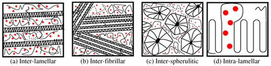 Possible mechanisms of segregation in drug/polyethylene oxide solid dispersion: inter-lamellar (a), inter-fibrillar (b), inter-spherulitic (c) and intra-lamellar (d). Red points represent drug molecules. Reproduced with permission from [24].