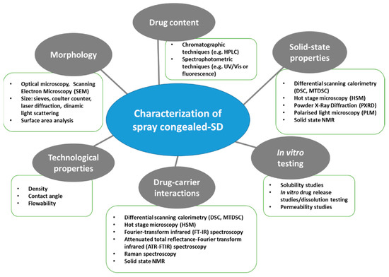 A thorough evaluation of the spray congealed SD properties is essential as they have a direct impact on the technological and biopharmaceutical behavior of the system. Figure 4 shows a schematic classification of the relevant MPs properties and of the techniques used for their analysis.