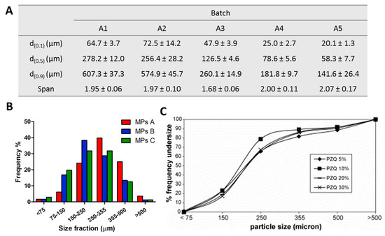 Particle size distributions of spray congealed microparticles (MPs) based on Gelucire® 50/13. (A) Effect of different atomizing air pressure (increasing pressure values passing from A1 to A5); (B) composed of Gelucire® 50/13 and Gelucire® 48/16 in ratios of 100:0 (MPs A), 50:50 (MPs B), and 30:70 (MPs C) and loaded with 10% w/w of indomethacin; (C) containing different amount of drug praziquantel (PZQ). Figures adapted with permission from [19,36,45].