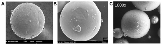 Morphology of spray congealed MPs based on different hydrophilic excipients. (A) PEG 3350; (B) Poloxamer 407; (C) Gelucire 50/13. Figures adapted with permission from [49,50,51].