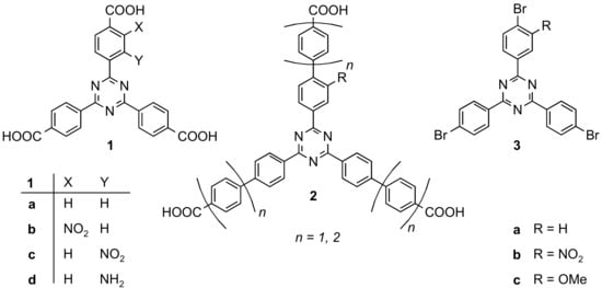 Tridentate mono-substituted triazine based linkers 1 and 2 [13,14]. The elongated tricarboxylic acids 2 were synthesized from the respective tribromides 3a–c using Suzuki-Miyaura couplings.